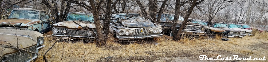 1959 Oldsmobile 88, 1961 Plymouth Fury wagon, 1964 Ford Galaxie 500, another ’59 Olds 88, 1957 Plymouth Custom Suburban, 1959 plymouth Savoy and at the far right, 1960 Buick Invicta.